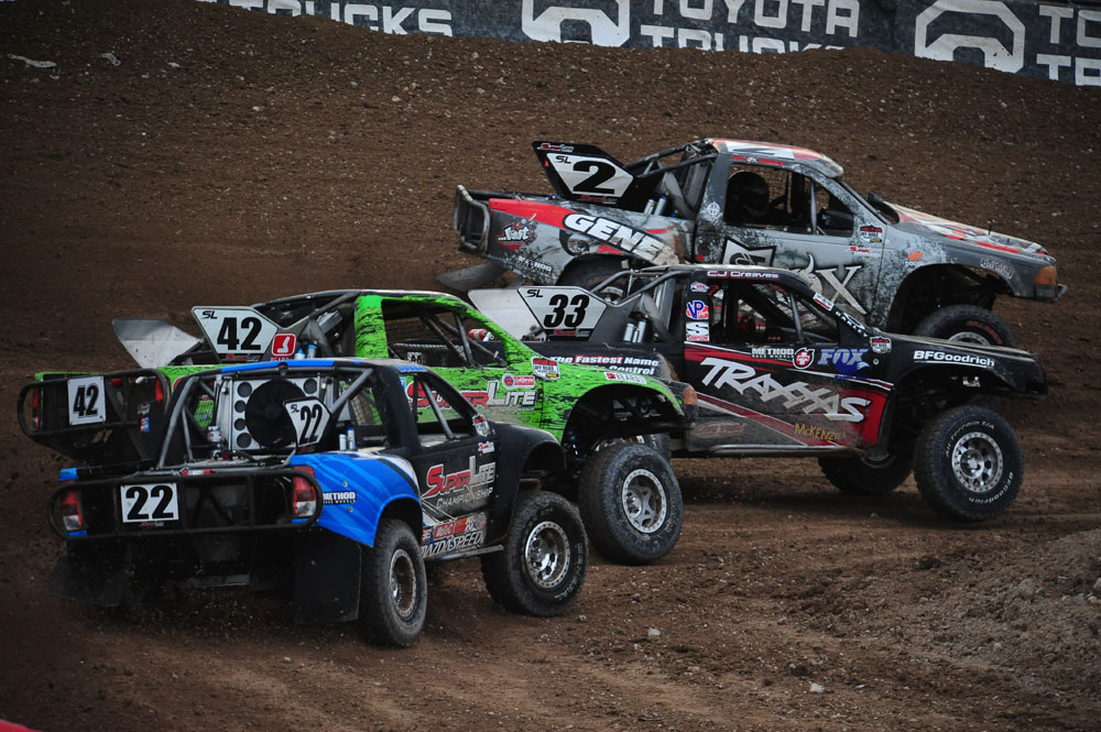 Super Lite Super Lite saw a championship lead change in yesterday's race, and with many drivers still well within reach of the title, anything was possible in today's Super Lite race. After an inversion of the top six finishing positions from yesterday's race, it was RJ Anderson in the #37 Walker Evans Racing/VP Racing Fuels truck who started next to CJ Greaves in the #33 Traxxas/Oakley machine on the front row, but it was new championship leader Jeremy "Twitch" Stenberg who grabbed the lead at the end of lap one. Greaves and Anderson followed in second and third, with Kyle LeDuc fourth in the #24 So Cal SuperTrucks/Bully Dog truck, and Jeff "Ox" Kargola fifth in the #2 General Tire/Lost machine. Anderson was caught out by contact in turn two on the second lap, dropping him to the back of the pack. This moved LeDuc to third, Kargola to fourth, and Dawson Kirchner up to fifth in the #16 Speed Technologies/Method Race Wheels truck. Up front, Stenberg was starting to open up a gap on the rest of the field, while behind him, Greaves dropped from second to fourth, just before the competition yellow. At this point, Stenberg still led the field, with LeDuc, Kargola, Greaves, and Kirchner following in second through fifth. On the restart lap, Kirchner made some nice moves to go from fifth to third, and just ahead, it was LeDuc who made a beautiful pass on Stenberg in turn three to take the lead. Stenberg wasn't having any of it, however, as he re-took the lead in turn two on the next lap, and with LeDuc bobbling in turn three, both Kirchner and Kargola were able to get by and take over second and third. Kargola's time in a podium position was short-lived, though, as he rolled coming off the jump out of turn six, ending his race. The field roared by and headed for the white flag, with Stenberg, Kirchner, LeDuc, Greaves, and Chad George holding the top five spots with one lap to go. On the final lap, LeDuc rolled in turn two, which allowed Jacob Person into the top five. Up front, Stenberg kept his nose clean and took the win, further extending his championship lead in his #88 Rockstar/Metal Mulisha machine. Second went to Kirchner, with Greaves taking third, George fourth in the #42 Funco/Beard Seats truck, and Person fifth in the #29 Stand-Up MRI of Arizona/Canidae truck. Stenberg's fourth place yesterday and his win today have vaulted him into the championship lead, and he'll take a 22 point lead over George into the final round at Firebird. Greaves sits a further three points back, with Person fourth, 23 behind Greaves, and Kirchner still mathematically in it, 50 points behind first place Stenberg.