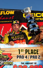 All the points races have been tallied. All the championships have been decided. All that's left are the big money races- it must be time for the 2010 Rockstar Energy Lucas Oil Challenge Cup! That's right, it's the final race day for the 2010 Lucas Oil Off Road Racing Series, presented by Geico Powersports, and it was another beautiful day to be at the races here at Firebird International Raceway here in Chandler, AZ. The grandstands appeared full to bursting today, and all those lucky people were hosted to a real treat here at the season finale. In case you missed it, here's how the day's events unfolded. UTV First out on track today were the UTVs. Greg Frantz started his #877 Lonestar Racing/HiPer Yamaha alongside the #824 Muzzys Performance Products/Bronco Yamaha of Dan Kelly on the front row, with Kelly leading the field past the stripe at the end of lap one. In second it was Doug Mittag in the #848 Long Travel Industries/Gear One Yamaha, followed by the #664 Xtreme Machine and Fabrication/Racin' Dirty Kawasaki of Robert Vanbeekum in third, Ryan Beat and his #851 HRT Motorsports/Osborn Racing Yamaha in fourth, and Chad George in the #642 Monster Energy/C&G Performance Kawasaki in fifth. Mittag and Beat both jumped past Kelly to take over first and second on lap two, with Kelly falling down to third, ahead of Vanbeekum and George. After figuring out that he too could do the step up double jump yesterday, Mittag now had an answer for the tremendous speed of Beat, and the two were pulling away from the rest of the field. Further back, Kelly's right front suspension was beginning to look a little suspect, but it was an apparent motor failure that took him out of the race. Shortly before Kelly's exit, Beat finally got a better run than Mittag into the either/or section, grabbing the lead as the two continued to battle. Mittag was determined to get the position back, but an over-eager flight off the first jump resulted in a big rollover for the young driver, and his challenge for the race win was over. Mittag's wreck brought out a full-course caution, with the running order now Beat, Vanbeekum, Austin Kimbrell, George, and Corry Weller in the top five. These five held their positions after the restart, with Beat pulling away up front. Weller then slowed briefly, which allowed Frantz to overtake her and move up to fifth. Further forward, Kimbrell got a great drive into the turn four split for the either/or section in his #607 Monster Energy/UTVUnderground.com Kawasaki, and took over second from Vanbeekum just ahead of the white flag. Sadly, though, Kimbrell slowed to a stop coming out of turn three on the final lap, and was forced to the side within two turns of the finish line. At race's end, it was Beat who picked up back-to-back wins in SR1 and overall this weekend, with Vanbeekum taking first in Unlimited UTV, second overall. George finished third, Frantz fourth, Weller fifth in the #801 Weller Racing/Maxxis Tires Yamaha, and rounding out the Unlimited UTV podium was Kimbrell, despite his not finishing the final lap. The top three finishers in each class were awarded with gift certificates for free driving lessons at Cory Kruseman's Sprint Car and Midget Driving School Driving School, the official driving school of The United States Auto Club, located in Ventura, CA. Modified Kart After a thrilling season finale yesterday, the drivers of Modified Kart definitely had some extra fans in attendance for today's cup race. Anthony Busnardo and Myles Cheek started on the front row, but it Brandon Vermillion in the #585 MavTV/Hart and Huntington kart who took the early lead, followed by Cheek in the #557 CMI/JamminProducts.com machine, Sheldon Creed, Mitch Guthrie Jr., and Zac Hunt. Creed moved his #522 Team Associated/Lucas Oil truck up to second on lap two, with Guthrie Jr. close behind in third in his #555 Walker Evans Racing/Super Kart machine. Guthrie Jr. then made great use of the lower line in the two-line section of the track, jumping from third to first as he drifted beautifully onto the front straightaway and into the lead. Creed picked up a spot right behind Guthrie Jr. after Vermillion went too wide and hit the outside catch fence coming onto the front straight, and now ran in second. Further back, Hunt was up to fourth in the #534 Speed Energy/Creative Fabrication and Design truck, with Trent Williams, making a return to competition in Riley Herbst's kart after a long hiatus, now fifth in the #525 Victory Race Cars/Terrible Herbst machine. At the competition yellow, it was still Guthrie Jr. leading the pack, with Creed second, Vermillion third, Hunt fourth, and Williams fifth. On the restart lap, someone got into the back of Creed and rolled him coming out of turn one, with Williams coming to a stop just behind Creed's stricken kart. A full restart was called for, and fortunately, neither Creed's nor Williams' karts were much worse for wear, with both drivers being able to take the restart. With green waving again, Guthrie Jr. went a bit wide in turn one and ended up going around the whole turn on two wheels as he tried to set his truck back down on all four tires. This lost Guthrie Jr. a lot of time, and dropped him out of the top five in this ultra-competitive field. Creed assumed the lead, having recovered quite well from his earlier rollover, with Vermillion second, Hunt third, Williams fourth, and Jerett Brooks now fifth in the #527 Synergy Electric Racing/Comfort Mechanical machine. Hunt then got up on two wheels and rolled coming out of turn one, and although he lost several positions, he was able to continue, just shy of one lap down. This moved Williams and Brooks up to third and fourth, and Connor Pankratz into fifth in the #511 Dickerson Motorsports/MasterCraft Safety entry. Up front, Creed was driving away from everyone, and he went on to take back-to-back wins in Modified Kart this weekend. Second went to Williams, who got by Vermillion in the late going. Vermillion fi