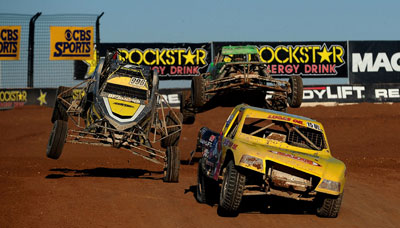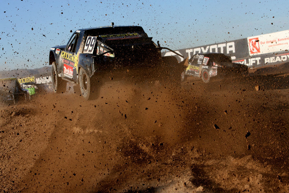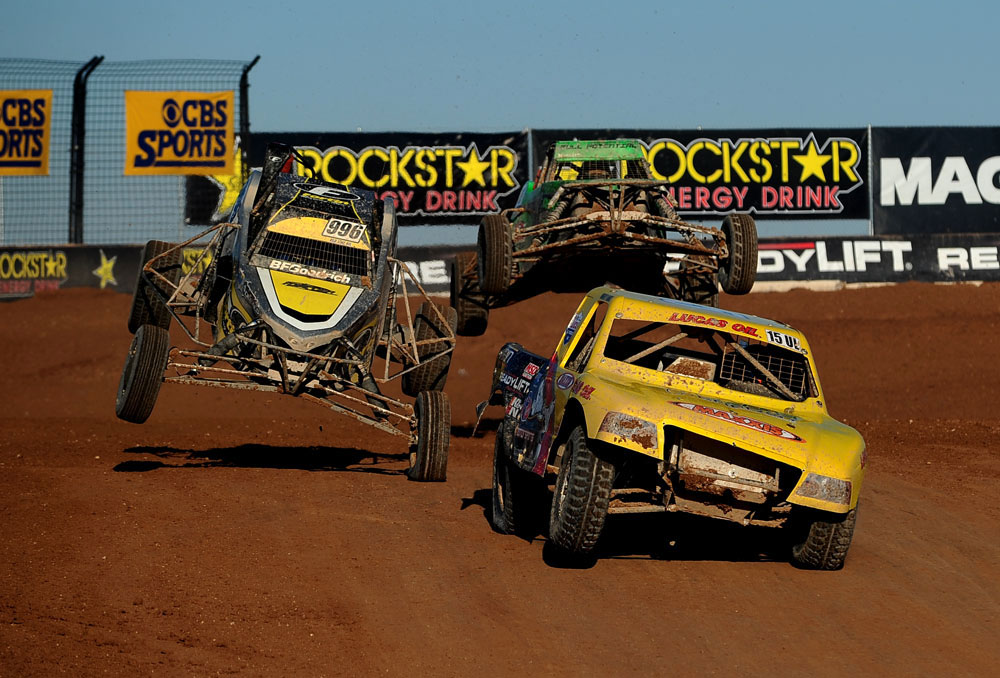 Pro Lite Unlimited vs. Pro Buggy Unlimited With six races in the bag on this final day of the 2010 Lucas Oil Off Road season, it was time for the last two events, and first up of the two top-billed races was the Pro Lite Unlimited vs. Pro Buggy Unlimited cup race. The inaugural running of this event was held last year, and the unique pairing of these classes made for an awesome spectacle, so hopes were high for another great race this year. The Pro Lite Unlimiteds would line up first (because of their slightly slower lap times), with the top ten drivers in points being inverted to make up the top ten places. Next would come the remaining trucks, then the inverted top ten in Pro Buggy Unlimited points, and finally, the remaining buggies. John Beyer and Stephan Papadakis started on the front row, with Malcolm Pointon and Mike Porter making up the first row of buggies. As a veritable buzzing nest of hornets circled the track behind the pace truck, the fans were on their feet for the awesome spectacle that was about to unfold. The green flag dropped, and all at once the angry swarm came to life, with Sean Geiser leading the way in his #16 ReadyLift Suspension Inc./Bully Dog Toyota at the end of the first of 19 laps. In second it was Marty Hart in the #15 Maxxis Tires/Kolpin Ford, followed by Jacob Person in the #92 Fiberwerx/Geiser Bros Design and Development Ford, Corey Sisler in the #19 Twisted Beverage Company/BFGoodrich Tires Ford, and Matt Loiodice in the #20 Impact! Racing/Competitive Metals Ford, with Justin Davis the first buggy in his #985 Kroyer Racing Engines/Hoosier Racer, running in twelfth place. On lap two, Geiser pulled off the track, handing the lead to Hart, with Sisler now second, Loiodice third, Person fourth, and Rodrigo Ampudia fifth in the #36 Papas & Beer/Fox Racing Shox Ford. Porter was now the first buggy, running eleventh in his #900 Redline Performance/Speed Energy AlumiCraft. Ampudia moved past Loiodice to take over fourth on lap three, with Porter picking off two trucks to move into ninth. Up front, Hart was quickly pulling away by lap four, undoubtedly trying his best to steer clear of the carnage behind. Loiodice moved up two spots to third, and Porter was now up another position to eighth, with Davis also now in the top ten, just behind in ninth. Drivers shuffled significantly on lap five, with Brian Deegan climbing to fourth in his #38 Rockstar/Lucas Oil Ford, Ampudia and Person falling to fifth and sixth, and Davis now the first buggy in seventh. Porter ran in eighth, with Chuck Cheek moving his #957 LAMB Energy/Lucas Oil AlumiCraft up to tenth to make it three buggies in the top ten. Up front, Hart remained well clear at the end of lap six, with Loiodice and Deegan moving past Sisler to take over second and third, and Davis now up to fifth, three cars ahead of the next buggy.