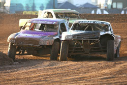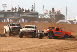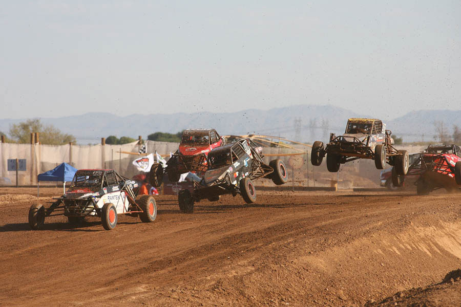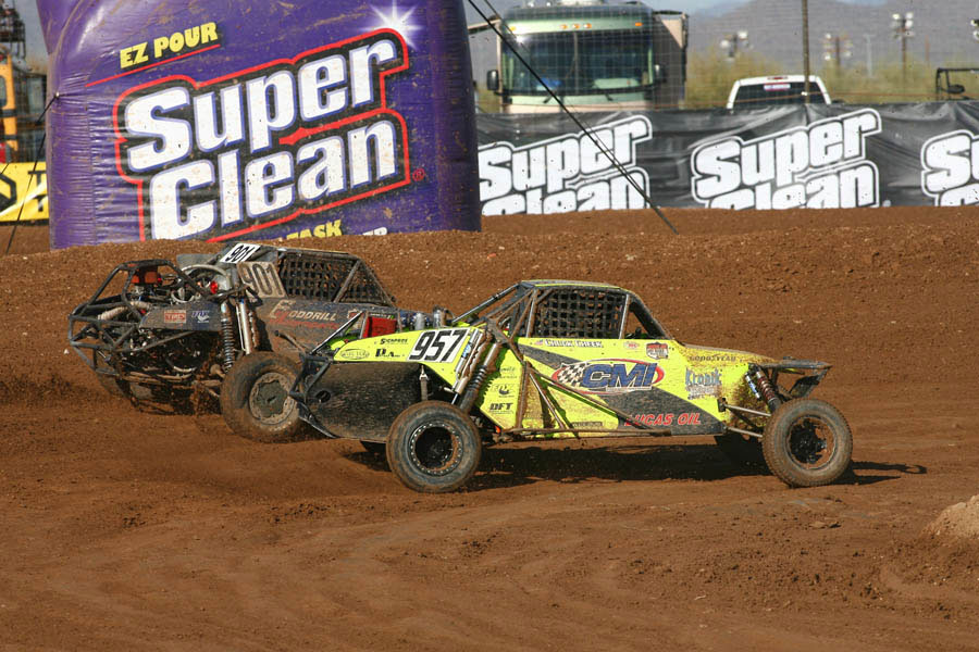 Unlimited Buggy In today’s Unlimited Buggy race, points title chasers Chuck Cheek and Mike Halliday picked up where they left off yesterday. Mike Dondel and Bobby PeCoy started on the front row, and PeCoy edged out Dondel to hold the lead at the end of the first lap. Halliday ran third in his #904 Green Army/Gatorwraps Alumicraft, with Cameron Steele lying fourth and Rich Ronco in fifth. The big mover was Cheek, and he did so in the wrong direction, falling all the way to 15th on the opening lap after a spin in turn two. However, Cheek showed that he wouldn’t be giving up easily, and he fought his way back through field to sit in eighth by the time the competition yellow came out. Up front, the order in the first five was the same as it’d been since the end of lap one, but as the track went green again, Steele and Cheek made fantastic restarts to take over second and third places. Steele soon fell back after a brief off-track excursion, allowing Dondel to re-take second as Cheek was partially slowed by Steele’s off. A slight bobble by Dondel let Cheek through and into second, and after Cheek’s demonstration of a never-say-die attitude, it was time for Halliday to show what he was made of. Halliday answered his rival’s challenge by passing Dondel outright and moving into third place. With one lap to go, Cheek’s misfortune caught back up with him again, this time in the form of a flat left front tire. Halliday seized the chance to move past his rival, and in a near-photo finish, he pipped Cheek at the finish line to take second. Nobody was fast enough to catch PeCoy, who lead start-to-finish in his #973 Earth Basics/Goodyear Alumicraft, taking the win in fine form. Halliday took second, with Cheek rounding out the podium in his Lucas Oil/Kronik Energy Alumicraft. Steele recovered from his earlier off to take fourth in the #916 Menzies Motorsports/Metal Mulisha Alumicraft, and Dondel had to settle for fifth this time out in his #998 Fortin/Fox Racing Shox Racer Engineering buggy.