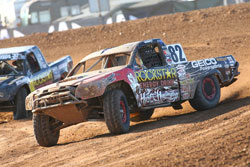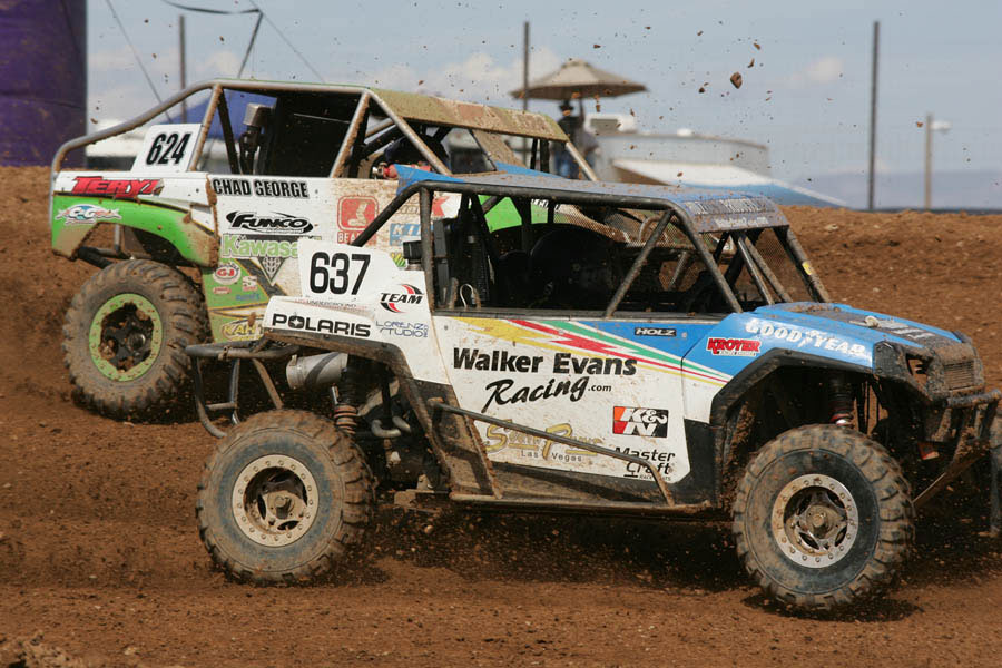 Super Lite Once again, Chad George was the top qualifier for today’s Bully Dog Super Lite race, going a perfect four-for-four in UTV and Super Lite qualifying this weekend. However, he was once again hindered by the inversion, which put Brandon Ward and John Harrah on the front row for the start of today’s race. Points leader Harrah jumped out to the early lead in his #13 Speed Technologies truck, followed by Brandon Bailey in the #72 Lamb Energy machine, George in his #42 Independent/Blanco Basura truck, Joey Granatelli in the #20 WD-40/Verve! entry, and so-far unbeaten driver Ricky James in the #24 So Cal Supertrucks machine. Bailey rolled over in turn two, and with Granatelli dropping back, Chad Leising and Dawson Kirchner were now running fourth and fifth. Up front, James was putting in another great drive, moving past Harrah and George through the long turn six to take over first place. George dropped out soon afterwards, leaving James, Leising, Harrah, Kirchner, and Granatelli in the top five as the competition yellow dropped. Once green flag racing resumed, several drivers had hiccups of varying degrees. Harrah was slowed by a hood that was coming off, Granatelli was black flagged for a reason unknown to this reporter, and Bailey had his second roll of the race, this time in spectacular fashion as he went backwards off the outside burm in turn five. Ahead of all the wreckage, the skills which Leising had put to such good use earlier this season were finally re-emerging as he took the lead in his #17 Geico Powersports/Lucas Oil truck. Leising ran strong through the end to take the win, handing James his first loss in LOORRS competition. James had to settle for runner-up, ahead of Kirchner in the other Speed Technologies truck, Chuck Dempsey in the #50 XDP/Skin truck, and Ward’s #92 NOS Energy Drink machine. Unlimited 4 The big, bad, fire-breathing beasts of Unlimited 4 were up next, and with only two rows being inverted from this morning’s qualifying, Alan Pflueger and Adrian Cenni started side by side on the front row this afternoon. Cenni led the field past the start/finish line at the end of lap one, with Pflueger, Renezeder, Coyne, and Tim Herbst in the #18 Terrible Herbst/Miller Lite Chevrolet in tow. Renezeder moved his #1 General Tires/Lucas Oil Ford past his teammate Pflueger to grab second spot, while further back, Coyne dropped out, which allowed Troy Herbst’s #19 Terrible Herbst/Coors Light Chevrolet into the top five. Action was fast but smooth, and Cenni was using an unusual line in turn four to great effect as his #11 Atrium Chevrolet was still running strong up front as the competition yellow flag waved. Behind Cenni still sat Renezeder, waiting to pounce should Cenni falter. Pflueger ran third, with the Herbsts, Tim and Troy, in fourth and fifth. After the track once again went green, the Herbsts both ducked into the hot pits with flat tires. Josh Merrell and Bryce Menzies briefly inherited spots in the top five, only to drop out of the race with separate issues. Up front, Renezeder was really turning the screws on Cenni, and with one lap to go, the crowd was on its feet to cheer on the underdog who they call “The Wild Man,” Adrian Cenni. Cenni drove brilliantly to hold off Renezeder and take the win, causing most all those in attendance to pump their fists and cheer in approval. Renezeder had to be satisfied with second place this time, while Pflueger took third in the #71 K&N/KMC Wheels Chevrolet. Troy Herbst eventually finished fourth, ahead of his brother Tim in fifth.