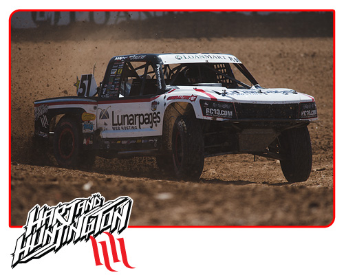 For Hart and Huntington Team Driver, Robert Naughton in the #54 Lunarpages PRO-2, the weekend proved to be a struggle. The track conditions were difficult to setup for as the surface was constantly changing under the hot sun. The track workers would flood the course leaving a muddy slick mess for the many trucks to start the race. It would quickly dry out in certain areas but still leaving wet patches for the racers to deal with. Finding the right setup was a tremendous challenge for all, and those who dialed in the setup, found the speed and left everyone else in the dust.